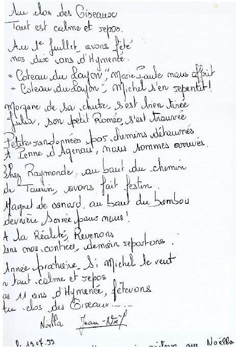 "Au Clos des Oiseaux Tout est calme et repos. Au 1er juillet, avons fêté Nos 10 ans d'hyménée. "Coteaux du Layon", Marie-Paule nous offrit, "Coteaux du Layon", Michel s'en repentit ! Morgane de sa chute, s'est bien tirée, Julia, son petit Roméo s'est trouvé. Petites randonnées par chemins détournés à Penne d'Agenais, nous sommes arrivés. Chez Raymonde, au bout du chemin, de tourin, avons fait festin. Magrets de canard, au bout du bambou, dernière soirée pour nous ! A la réalité, revenons Dans nos contrées, demain repartons. L'année prochaine, si Michel le veut, En tout calme et repos Nos 11 ans d'Hyménée, fêterons au Clos des Oiseaux... Noëlla, Jean Noël (11 juillet)