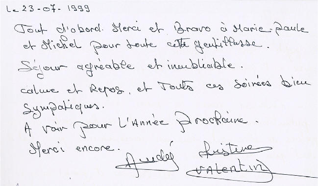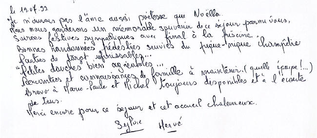 "Je n'aurai pas l'âme aussi poétesse que Noëlla, Mais nous garderons un mémorable souvenir de ce séjour parmi vous, Soirées festives sympathiques avec final à la piscine, Bonnes randonnées pédestres suivies du pique-nique champêtre, Parties de tarot infinissables ... "Petite douche" bien agréable... Rencontres et connaissances de famille à maintenir (quelle équipe !...) Bravo à Marie-Paule et Michel, toujours disponibles et à l'écoute de tous. Merci encore pour ce séjour et cet accueil chaleureux. Sylvie et Hervé)