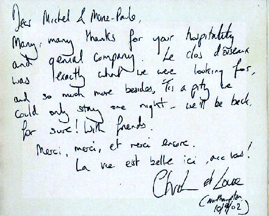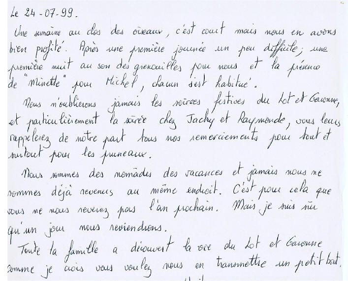 Une semaine au Clos des Oiseaux, c'est court mais nous en avons bien profité. Après une première journée un peu difficile ; une première nuit au son des grenouilles pour nous et la présence de "minette" pour Michel, chacun s'est habitué. Nous n'oublierons jamais les soirées festives du Lot et Garonne, et particulièrement la soirée chez Jacky et Raymonde, vous leur rappellerez, de notre part, tous nos remerciements pour tout, et surtout les pruneaux. Nous sommes des nomades des vacances et jamais nous ne sommes déjà revenus au même endroit. C'est pour cela que vous ne nous reverrez pas l'an prochain. Mais je suis sûr qu'un jour nous reviendrons. Toute la famille a découvert la vie du Lot et Garonne, comme je crois vous voulez nous en transmettre un petit bout. Merci beaucoup les gascons, c'était super sympa. Philippe