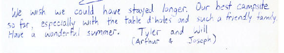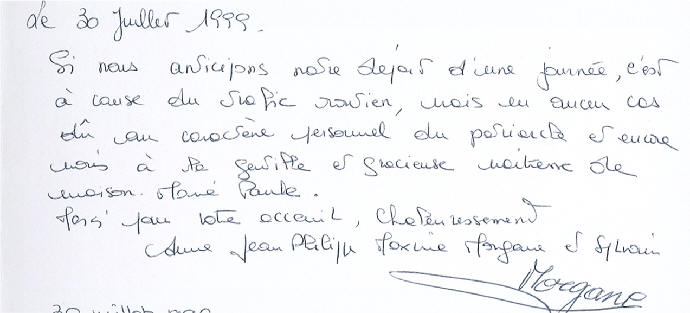 Si nous anticipons notre départ d'une journée, c'est à cause du trafic routier, mais en aucun cas du au caractère personnel du patriarche et encore moins à la gentille et gracieuse maîtresse de maison Marie-Paule. Merci pour votre accueil, chaleureusement Anne, Jean Philippe, Maxime, Morgane et Sylvain (30 juillet)