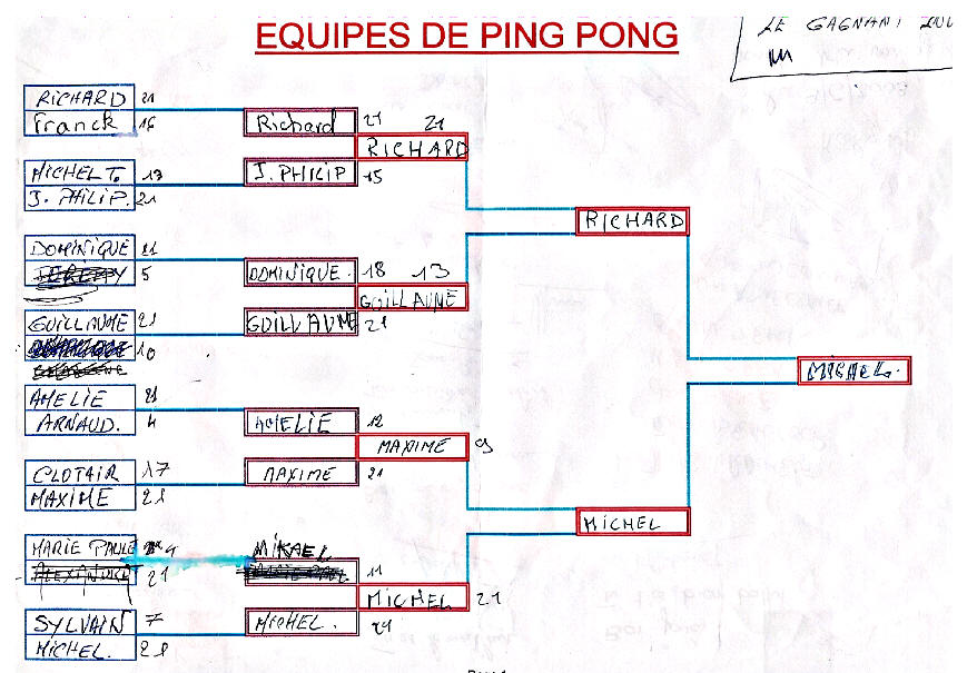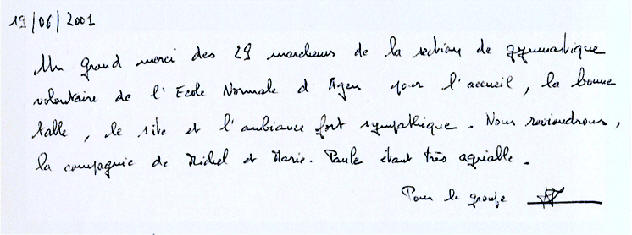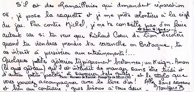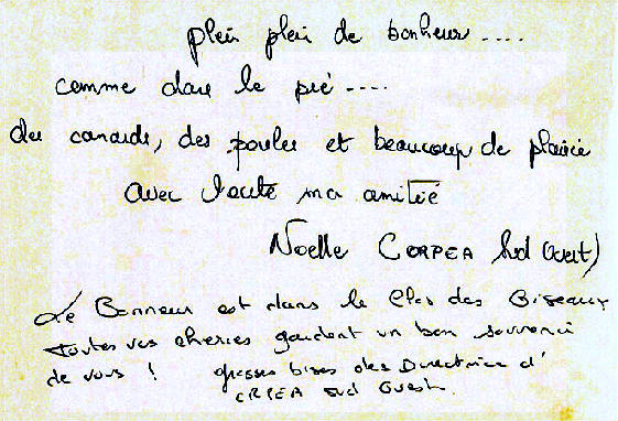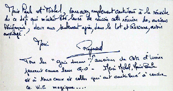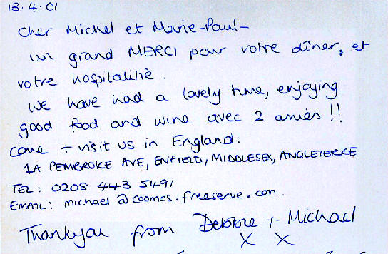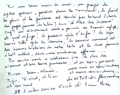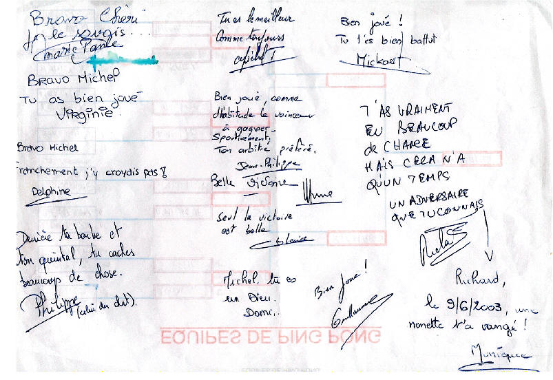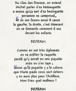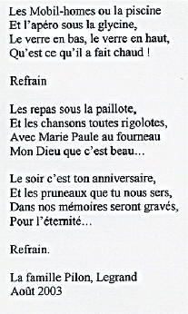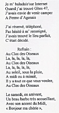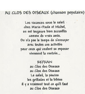 Au Clos des Oiseaux Les vacances, c'est chaud ! Le patron "Michel" est beau Et il joue bien au tarot ! (voir feuille des points) Marie-Paule, c'est la douceur même Et nous, on l'aime ! Mais le Clos, c'est surtout : - Les oiseaux, - L'apéro, - Le soleil "trop chaud", - Et les kilos en trop ! Tout cela, c'est bon pour les parigos ! Michel, Marie-Paule, on est chagrin, Car demain, On sera loin Au turbin Notre coeur et nos pensées seront longtemps Avec vous au Clos des Oiseaux... Pilou, Pilou, Zob Zob Zob... Contact Patrick, Denis, Amitiés Nathalie II, Philippe, Aurore, (Michel, je t'aime) Nathalie (résultat du Tarot) T'aurais pas dû, Michel, faire une garde "contre" ! (le petit dans le chien..dommage !) T'aurais dû préférer une garde "sans" Flavien, Julien, Salut Michou Ludo, Marine, Coco
